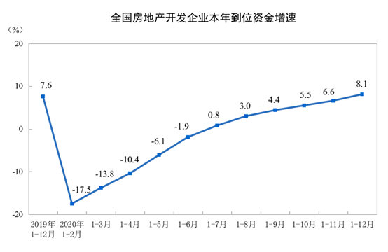2020年,房地产开发企业到位资金193115亿元,比上年增长8.1%,增速比1—11月份提高1.5个百分点,比上年提高0.5个百分点。其中,国内贷款26676亿元,增长5.7%;利用外资192亿元,增长9.3%;自筹资金63377亿元,增长9.0%;定金及预收款66547亿元,增长8.5%;个人按揭贷款29976亿元,增长9.9%。