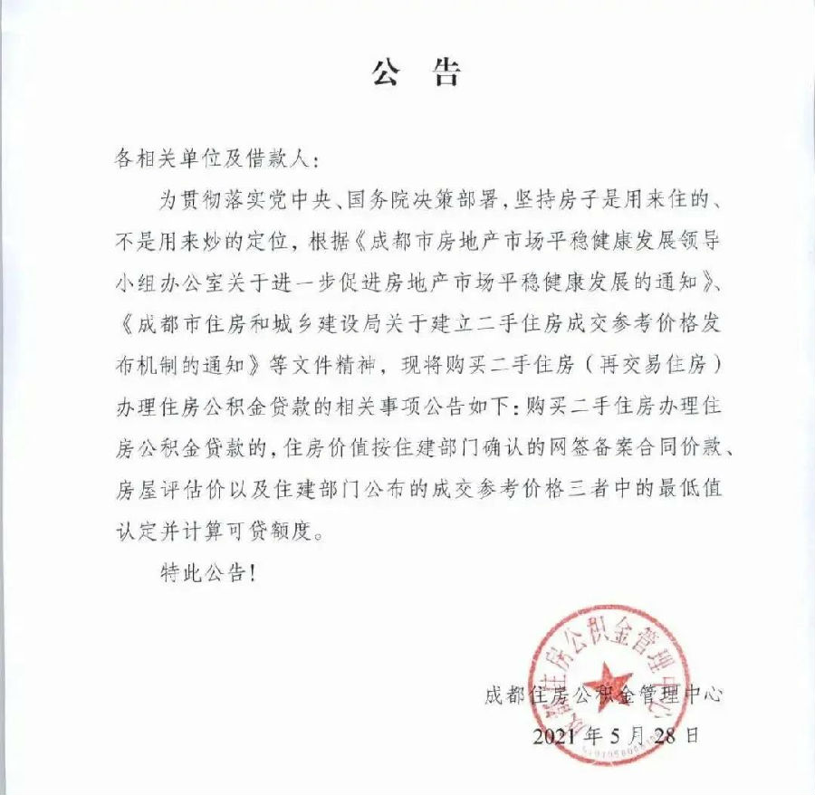 同日傍晚,成都住房公积金管理中心也发布公告: