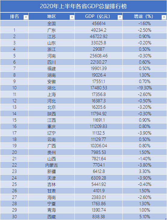 2020年上半年各省市GDP排行榜:排名发生哪些变化?
